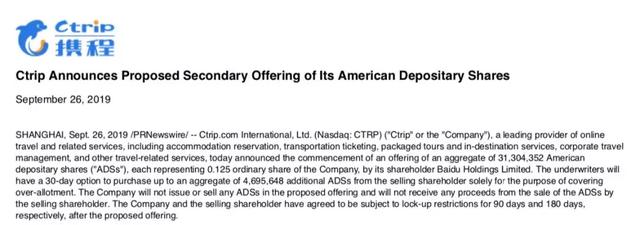 9月26日,携程发布公告称,大股东百度将出售其持有的携程股份。