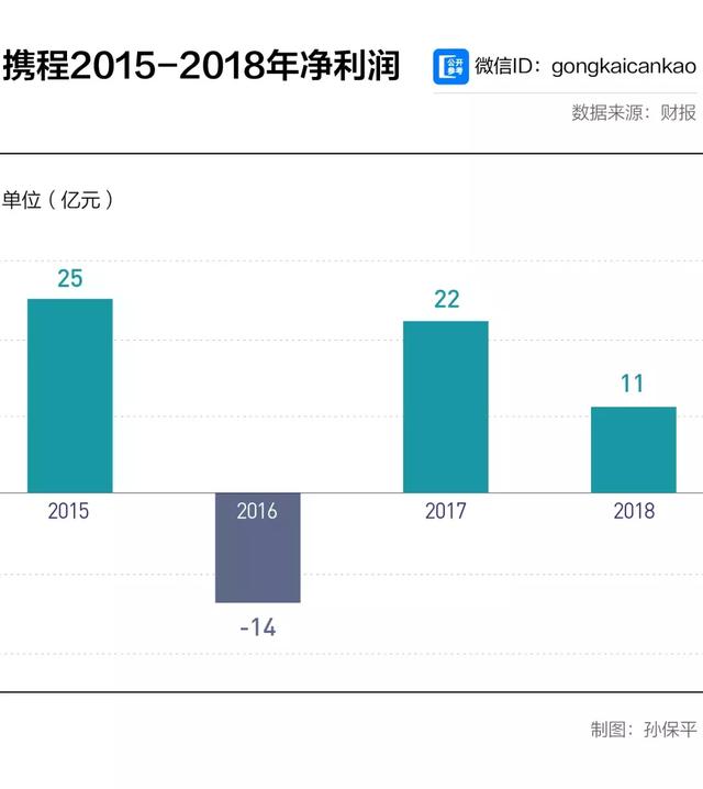 但让人意外的是,并购两家公司后,携程还是没赚到多少钱。近四年,携程利润最高的年份是2015年。