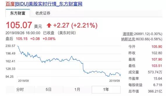 最近一年,百度的股价一路从230.47美元跌到105.07美元,跌了一半以上。目前,百度的市值只剩366亿美元,被京东、美团和拼多多超越。