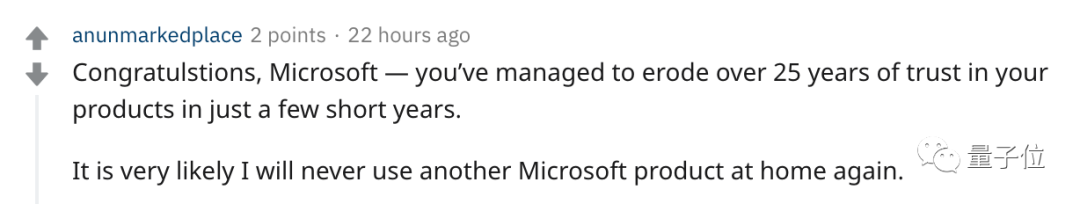“恭喜,微软只用了短短几年的时间,就让用户丧失了25年来的信任。我很有可能永远不会再在家里使用其他微软的产品了。”