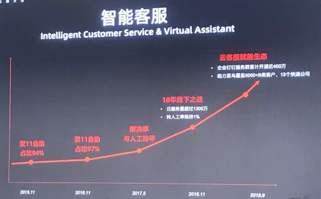 漆远告诉记者,2015 年,公司智能客服占比从原来的 69% 提升到了 95%,一年的时间,为公司节约了约一个亿的人力成本。2017 年 5 月,智能客服的问题解决率跟人工持平然后超越,用户可以在支付宝通过语音来购买高铁票,2018 年 11 月时,智能客服每天的服务量超过 1300 万,转人工比例仅为 1%,在今年,这项服务以云客服的形式,推广到企业钉钉和菜鸟,从 2C 走向 2B。
