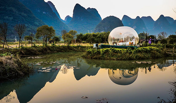 广西桂林阳朔县遇龙河畔,夜色中的民宿