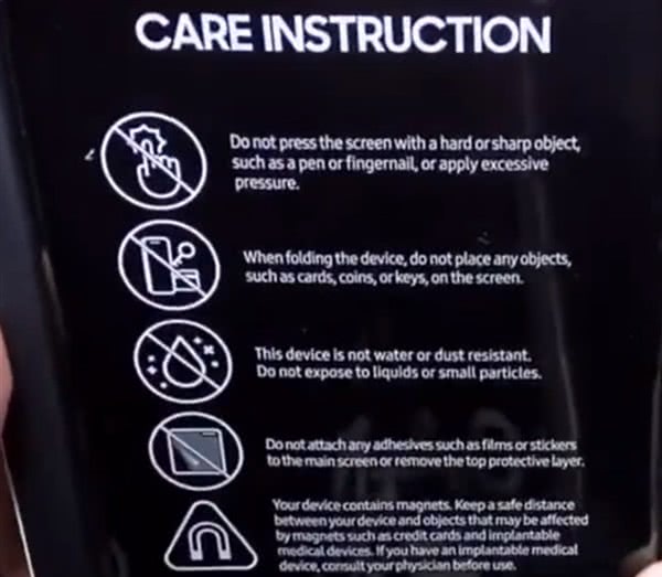 三星还表示由于Galaxy Fold内部含有磁铁,因此不要将其放置在信用卡、银行卡及钥匙、硬币等附近,三星还警告使用植入式医疗设备的用户,购买Galaxy Fold之前可能需要先咨询一下医生。