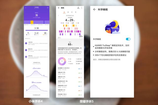 除了心率监测功能,睡眠监测也是用户比较关心的功能,目前睡不好成为了很多人面临的问题。荣耀手环5 搭载的HUAWEI TruSleep™2.0睡眠检测技术与哈佛医学院CDB中心深度合作,已在国内三甲医院进行临床对比验证,能够自动识别测试者的入睡时间和出睡时间,并判断测试者的睡眠状态(深睡、浅睡、快速动眼、清醒)针对各种睡眠问题。用户可以根据APP上的哈佛认证睡眠建议、睡眠音乐和舒缓解压等服务来改善睡眠习惯,提升睡眠质量。小米手环4 则仅可测试深睡、浅睡、清醒时长,相对来说简单了一些。经过我测试,确实荣耀手环5 要更加精准一些,早上明明睡到了解决9点,小米手环4 只显示到了7点10分,后面完全没有记录。