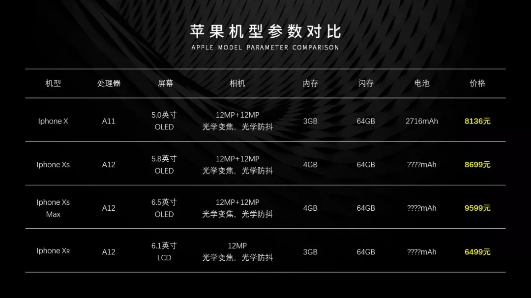 我们来看一下新版的三件套相对去年的 iPhone X 的性能参数对比。