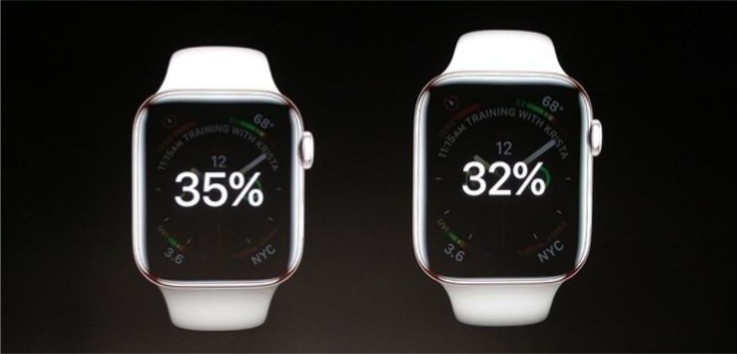 本次秋季发布会发布的第一款产品是 Apple Watch series 4,新一代的苹果手表边框大幅缩减,40mm 与 44mm 的机壳显示面积相较于旧版,分别增加了 35% 和 32%,对于视幅的提升非常显著。