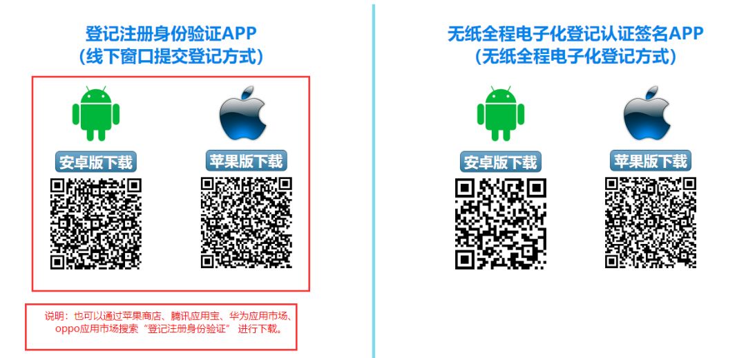 左侧是登记注册身份验证APP下载,可以扫描二维码进行下载,也可以通过苹果商店、腾讯应用宝、华为应用市场、oppo应用市场搜索“登记注册身份验证” 进行下载。