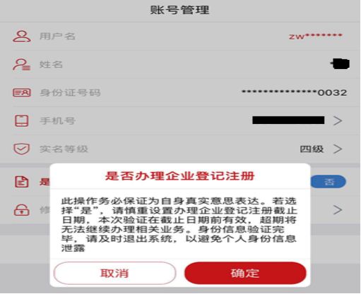注意:只有四级实名的用户才可以参与企业登记注册功能。是否办理企业登记注册选择“是”,选择企业登记注册截止日期。