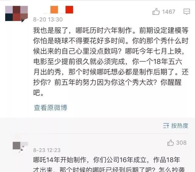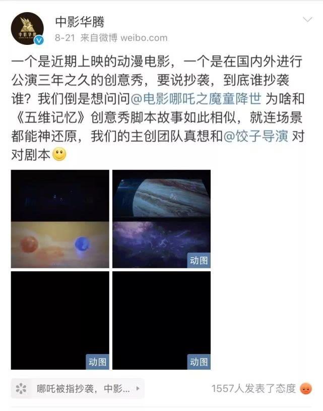 随后,8月21日,该博主所在的一家名为中影华腾的影视公司在微博上喊话,声称《哪吒》有多处抄袭的地方,并喊话饺子导演,要求对剧本。
