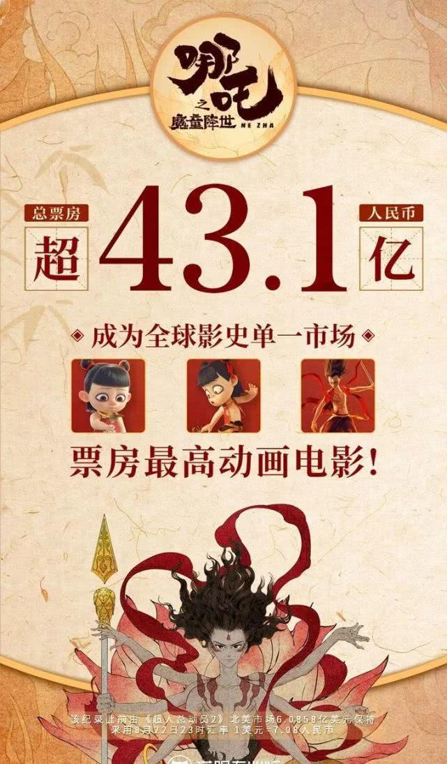 据猫眼统计,内地票房迈过43.1亿元,超过《超人总动员2》在北美创下的6.0858亿美元纪录,成为全球单一市场票房最高动画电影。