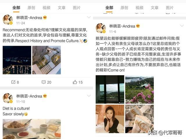 虽然出生豪门,但林晓芸并没有什么公主病,也不摆什么架子,为人十分低调。翻看她的微博会发现大多数的内容都是心灵鸡汤,有时还会配上自己日常生活照,也许有些人会觉得这些照片有些炫富,但这或许就是有钱人普通的日常生活。