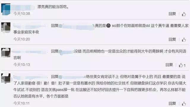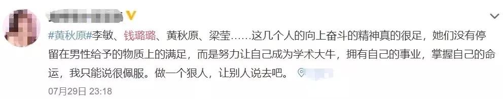 “她们没有停留在男性给与的物质上的满足,而是努力让自己成为学术大牛,拥有自己的事业,掌握自己的命运,我只能说很佩服。做一个狠人,让别人说去吧。”