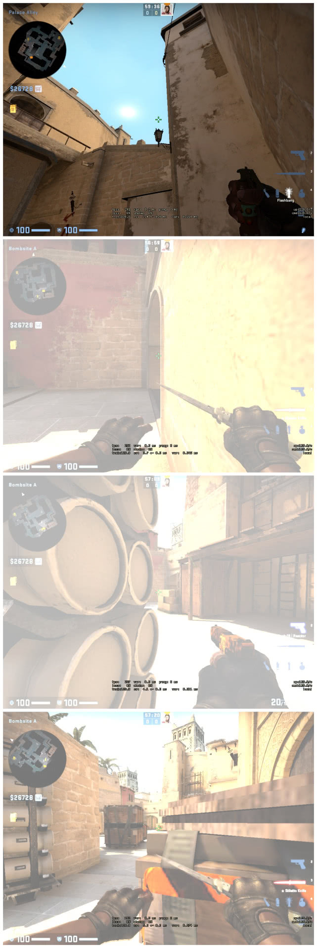 不过需要一个完美的闪光,A1队友在拉的时候可以连续丢出两个,而且还不会闪到队友~辣么你就需要职业哥们都在使用的指令:【‘bind’ 改成自己喜欢用的按键 "use weapon_knife;use weapon_flashbang"】这个指令绑定之后,按住‘更改之后的键位’可以快速切出闪光弹,然后在丢出第一个之后在按一哈就能无缝扔出第二个闪光弹了~这样子你就能连续扔出俩个闪光弹了,保证你能吊打‘三叶’~