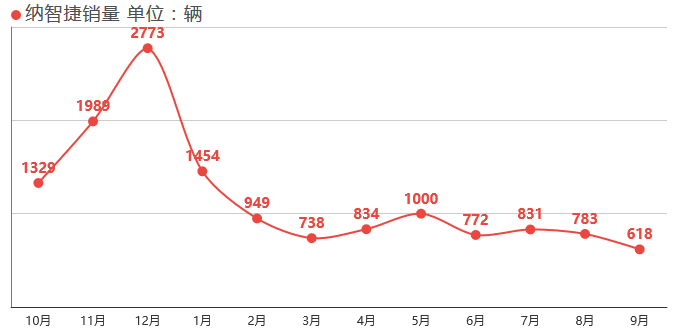 近三个月的销量也很可怜,7月份销量为831辆,8月份销量为779辆,9月份销量为618辆。2018年Q3季度纳智捷总共销量为2232辆,环比下降14%。今年1-9月累计销量7979辆,在所有车企排名第87名。