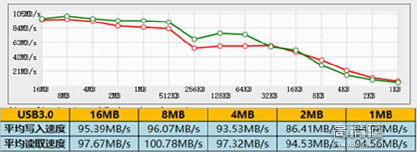 我们分别选取了16MB、8MB、4MB、2MB、1MB进行数据记录。我们以16MB为参考标准,平均写入速度为95.39MB/s,平均读取速度为97.67MB/s。