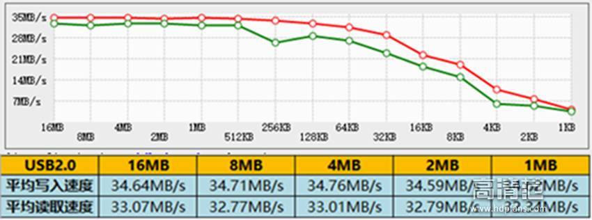在USB2.0接口数据速度测试中,我们可以看到16MB的平均写入速度为34.64MB/s,平均读取速度为33.07MB/s。
