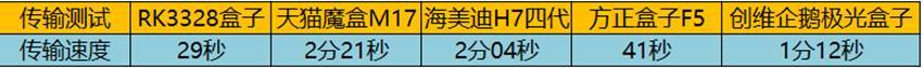 通过拷贝1.1G测试影片,从测试接口来看USB3.0传输速度最快,不过值得注意的是虽然其他四款盒子均为USB2.0接口,但是传输速度却相差较大,其中方正盒子F5速度最快而海美迪H7四代白金版和天猫M17则较慢。