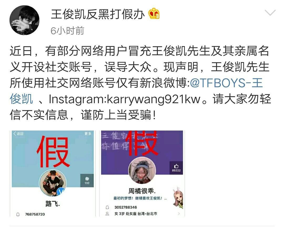 最近,有部分网络用户冒充王俊凯先生及其亲属名字开设社交账号,误导大众,也有很多粉丝相信了。对此王俊凯反黑办回应:请大家勿轻信不实消息,谨防上当受骗。有些人利用这样的虚假名义,可能会用言语欺骗一些粉丝,不管是思想还是财产上都是非常严重的。