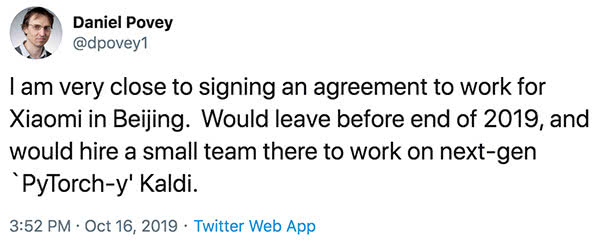 当地时间10月16日,全球AI语音识别大牛、前约翰霍普金斯大学教授Daniel Povey在个人推特上表示,“我非常接近达成一项协议:为位于北京的小米公司工作。我会在2019年底前前往(小米),并组建一支小型的团队,致力于下一代’PyTorch-y’Kaldi的工作。”
