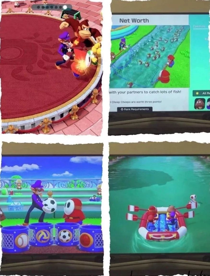 这次,《超级马里奥聚会》加入了历代游戏系列中没有的8种游戏模式。在玩家们熟悉的大富翁模式中,加入了可以进行团队战的“马里奥聚会 2on2”、 “迷你小游戏”模式。《超级马里奥聚会》共包含了80个全新的小游戏。新要素除了一个人就可以玩的“挑战之路”外,还囊括了适合和朋友家人4人同时操作的“河流生存”、 “换装节奏”、“联网竞技”、“玩具派对”等,玩家们投入到其中完全感觉不到腻味。