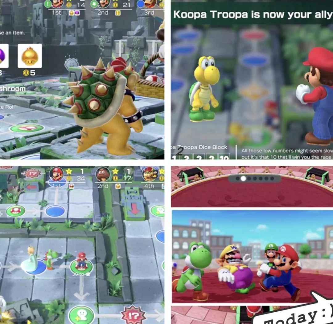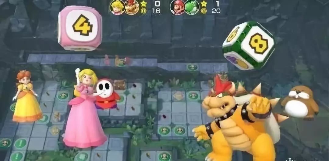 在“马里奥聚会”模式中可以在地图上看到遗迹、矿山、水果岛等等独特的风景。玩家选择角色投骰子,以地图上星星格子为目标前进,每回合结束时会有小游戏,如果获胜就有可能获得金币。