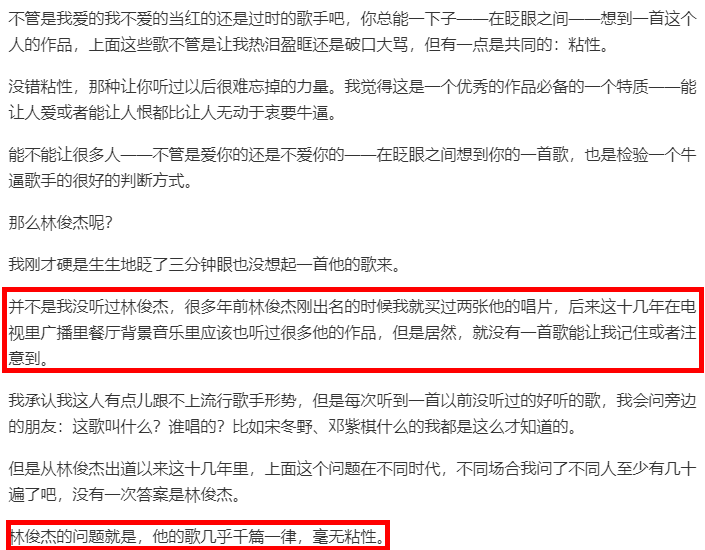 说记不得林俊杰的代表作,歌曲没有粘性,音乐风格千篇一律,大概歌手有自己坚持的风格也要被judge,说白了不就是您最近没有听林俊杰的歌吗?