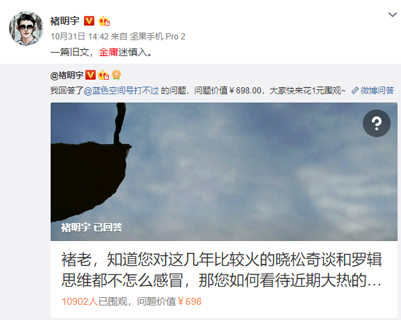 还有批判beyond的音乐,批评周星驰,甚至是批评金庸,在金庸先生去世之后,也立马转发了自己之前的回答蹭热度,褚明宇老师,下一个中招的是不是斯坦李老爷子?