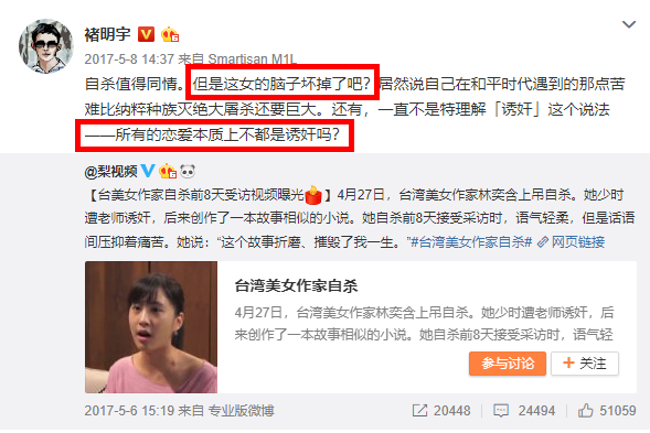 台湾作家林奕含因学生时代被性侵,写下《房思琪的初恋乐园》一书,后饱受阴影折磨最终自杀离世,年仅26岁,让我们看看褚明宇老师是怎么批判这样一位受害者的。