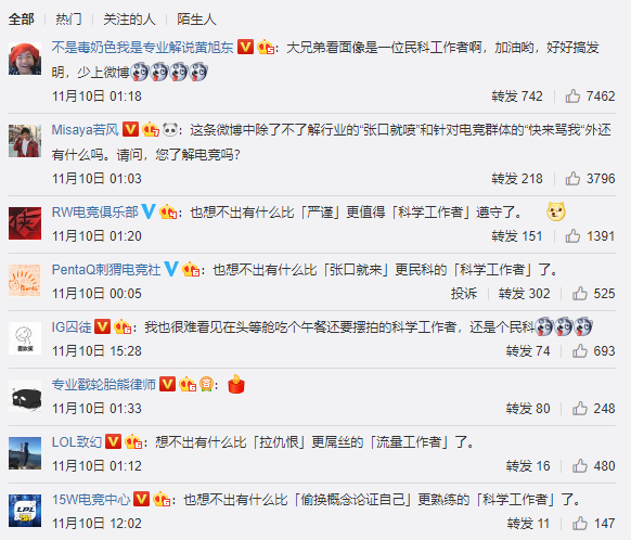 而小编看到这条微博的时候,第一反应是“这人谁啊?”,搜了一下资料,发现大家都有一样的困惑,再仔细看看他之前的微博,好像完全和电竞没有什么关系,看来只是又一个蹭热度的喷子罢了,不过这位科学工作者的微博着实有趣,不仅满嘴上等人下等人,还喜欢各种开地图炮。