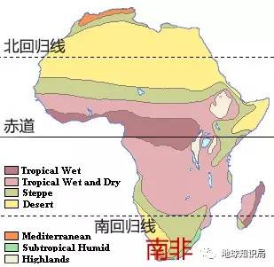 虽然非洲大陆主要位于热带,但最南端的南非则大部分位于南回归线以南,其亚热带和地中海式气候抑制了蚊子以及相关的热带疾病,这使得南非在殖民时代拥有很多欧洲移民,加上可耕地和丰富的矿藏,南非经济得以向工业化的方向发展。