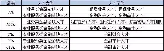 根据《上海金融领域“十三五”紧缺人才开发目录》,持有CPA、ACCA、CMA、CIA、CISA等会计证书的人才都是“十三五”金融人才规划的开发对象。