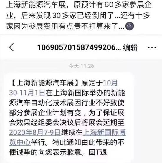 一时间流言四起。网传的一张短信截图称:原定于10月30日—11月1日举办的上海新能源汽车自动化技术展,因行业不好致使部分车企计划有变,延期至2020年8月举行。