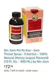 尽管该报道同时转述了美国当地专家对于服用京都念慈菴川贝枇杷膏可能会带来的潜在健康风险的警告,但是京都念慈菴川贝枇杷膏在美国仍然十分抢手,中药房售价7美元,在网上经由第三方的售价高达70美元,相当于人民币441元,但仍旧卖到脱销。