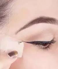 step2:黏在眼尾,要贴成你想要的眼线角度。注意一定要贴紧,否则很容易画不直。