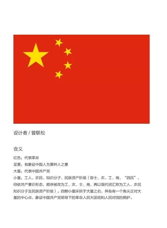 在这次会议上,毛泽东还对五星红旗的意义作了说明。他说,旗面的红色象征革命,旗面左上方一颗大五角星代表中国共产党,四颗小五角星代表现在我国人民所包括的四个阶级,即工人阶级、农民阶级、城市小资产阶级和民族资产阶级。每颗小星各有一尖正对大星的中心点,表示中国共产党领导下的革命人民大团结,和以工农联盟为基础的人民民主专政政权。旗上的五颗五角星及其相互关系,象征中国共产党领导下的革命人民大团结,五角星用黄色是为着在红地上显出光明。