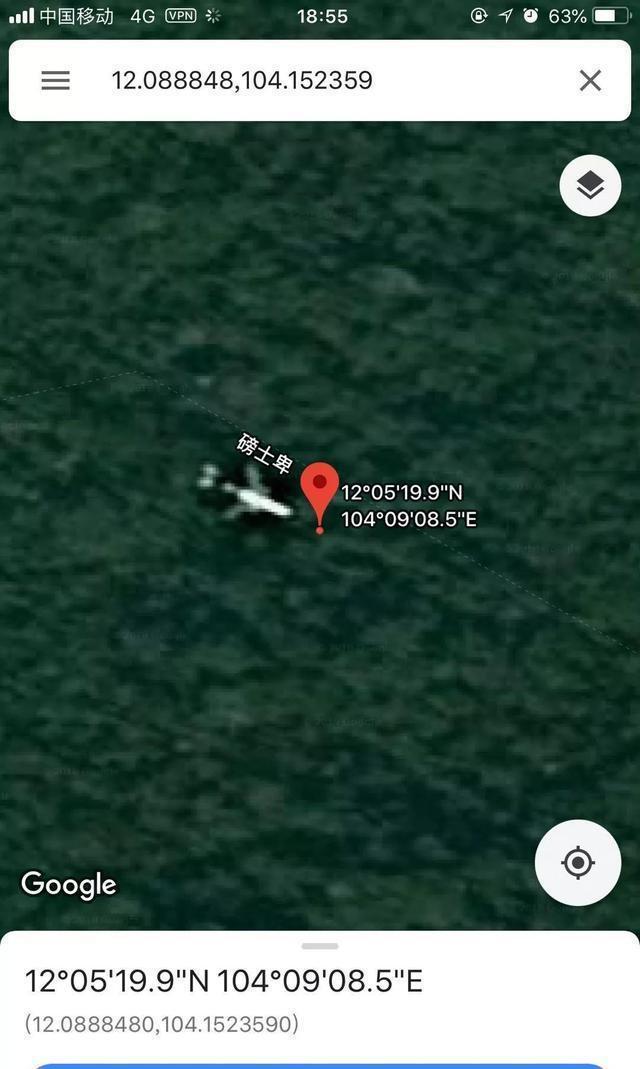 报道中英国专家伊恩威尔逊给了我们他看到飞机的经纬度位置,这是一组谷歌地图坐标12.089059, 104.151882。