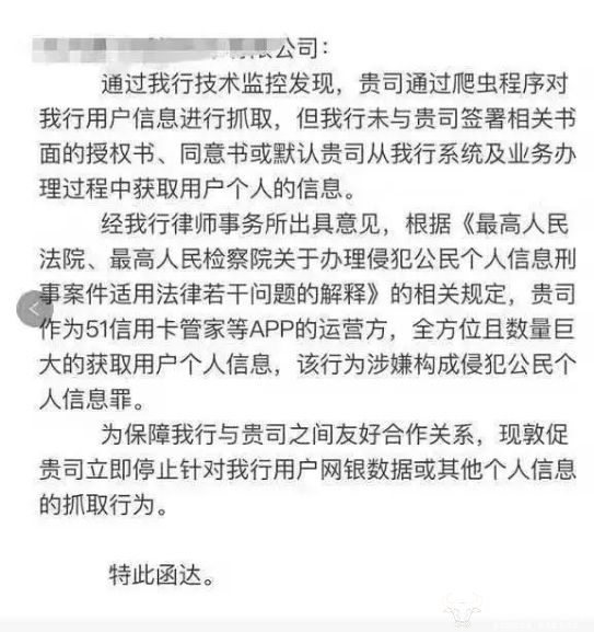 从网上流露出的函件看到,其原因可能是由于51信用卡使用爬虫程序抓取银行数据,而被银行方面举报所致。里面内容称,作为51信用卡管家等APP运营商,51信用卡在全方位且数量巨大的获取用户个人信息。该银行方面还在最后督促51信用卡停止抓取行为。