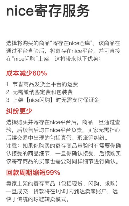 nice摊上“云炒鞋”的名头全是因为它推出的一个名为“闪购”的服务。“闪购”原本的目的是快速的实现买卖双方货物来往,本无可厚非,但是有着“寄售”服务配合味道就变了。