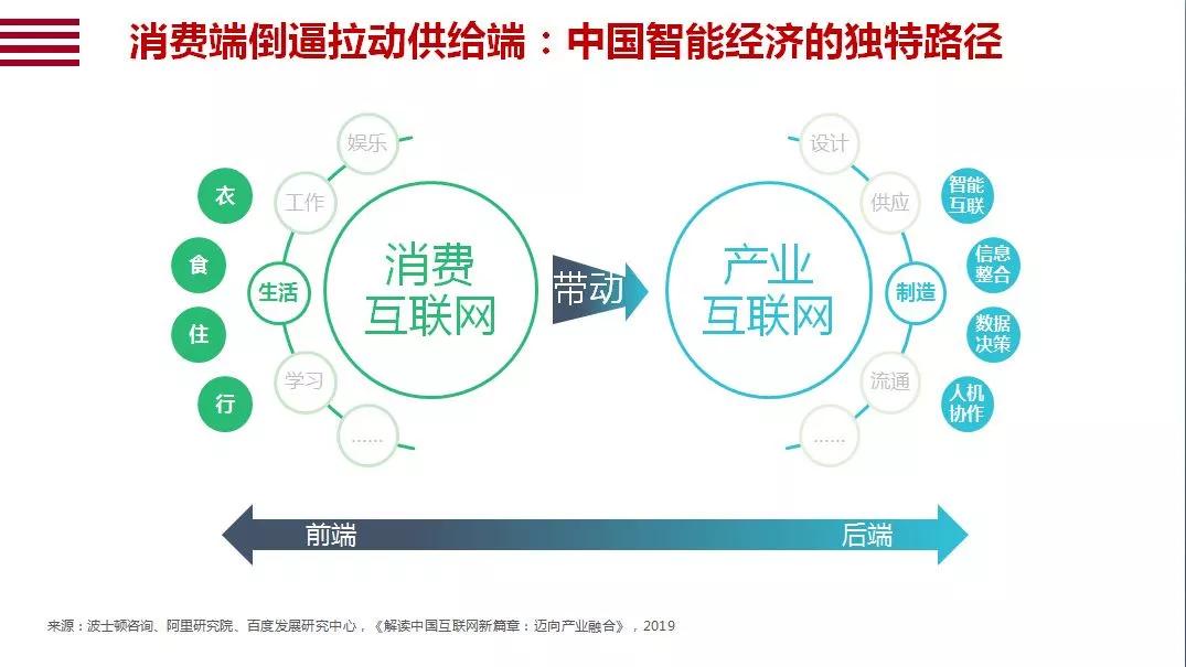 在波士顿咨询、百度发展研究中心和阿里研究院共同发布的《解读中国互联网新篇章:迈向产业融合2019》报告中,对“智能经济”的定义是: