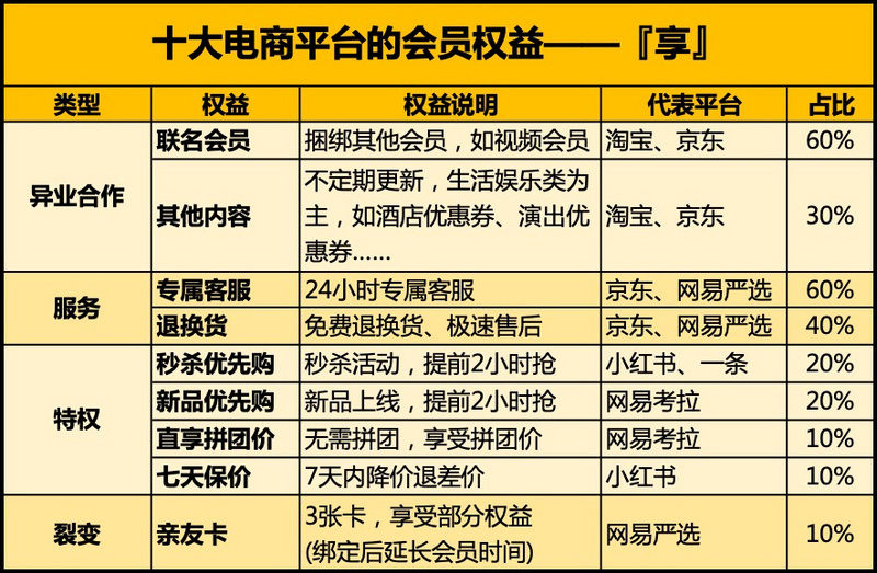 以上是利用「花得省享」模型,从“花”的维度对十大电商平台付费会员政策的解剖。同时,我们将电商平台的付费会员权益分成三大类:得、省和享。
