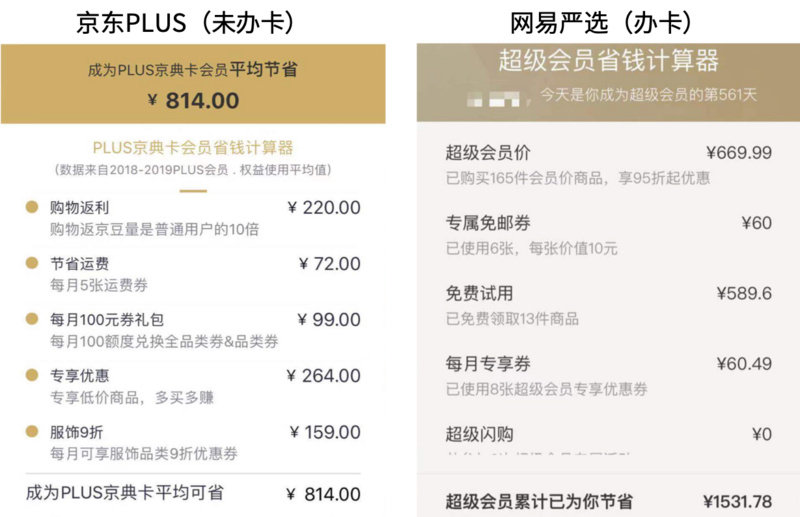 在未办卡以前,省钱计算器提供的数字会根据已办会员卡的平均值,如上图左边京东PLUS“成为PLUS京典卡会员平均节省814元”;办了会员卡以后,则变成了个人的数据,刺激你续费。如上图右边网易严选“超级会员累计已为你节省1531.78元”。