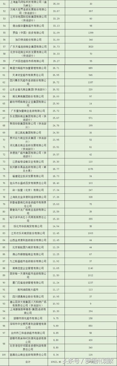 中商情报网讯:近日,2017年中国超市100强排名出炉。据榜单显示:进入榜单前十的超市分别是:华润万家、大润发、沃尔玛、永辉超市、联华超市、中石化易捷、家乐福、物美控股、供销大集集团以及中百仓储超市。其中,华润万家以1036.45亿元的收入占据榜首,成为中国超市、便利店行业的龙头老大,2017年华润万家拥有门店数3162个。排名第二和第三的分别是大润发和沃尔玛中国,销售额分别是954亿元和802.78亿元。以下是2017年中国超市100强排行榜的详细排名情况: