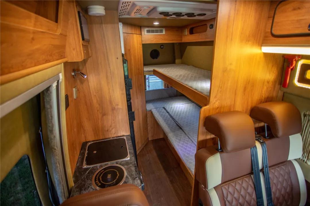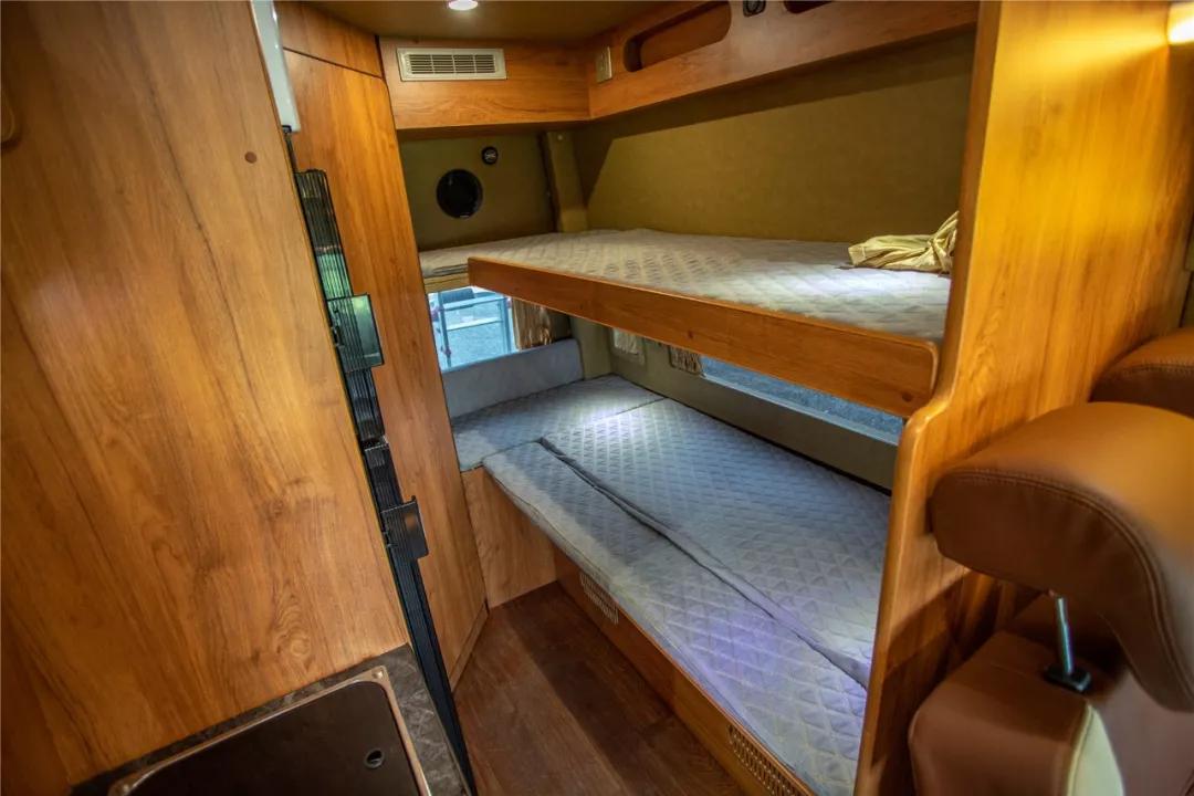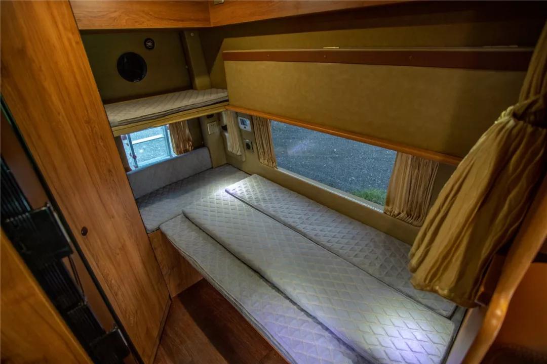 车上的主休息区是一组上下双层床,这组双层床可进行多项变动,便于满足日常不同的使用场景。