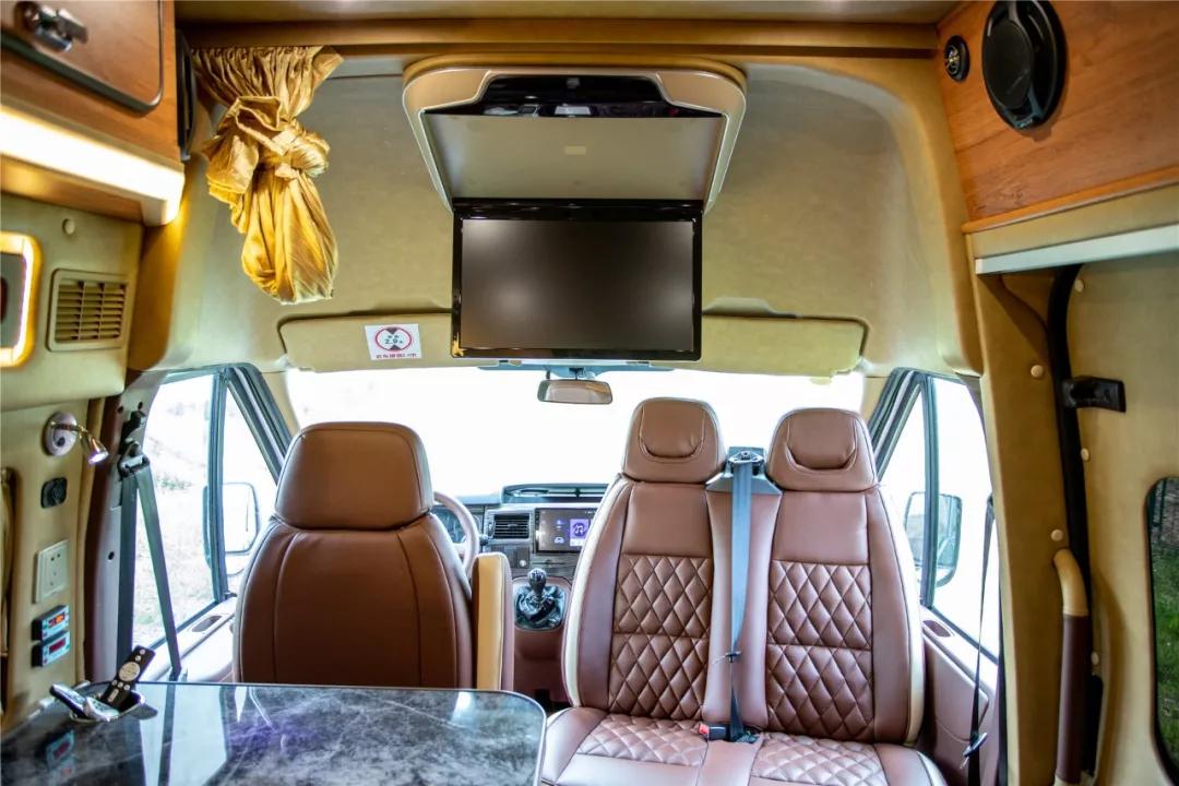 驾驶室上方设有一台吸顶折叠电视,搭配车顶卫星天线使用,便于在旅行途中观看自己喜爱的电视节目。