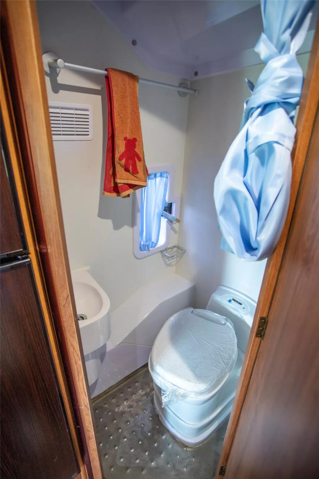 车上的卫生间位于车厢尾部,采用封闭式设计,内部空间尚可,提供了赛特福德马桶、淋浴、洗漱池、毛巾架等常用设备。