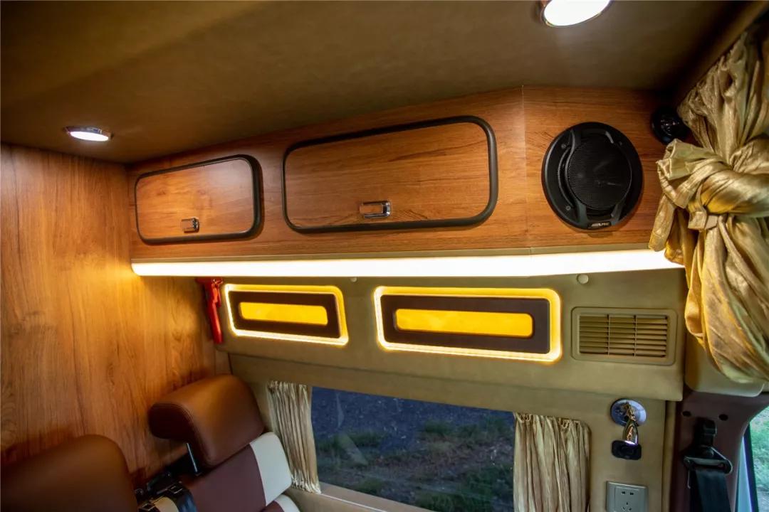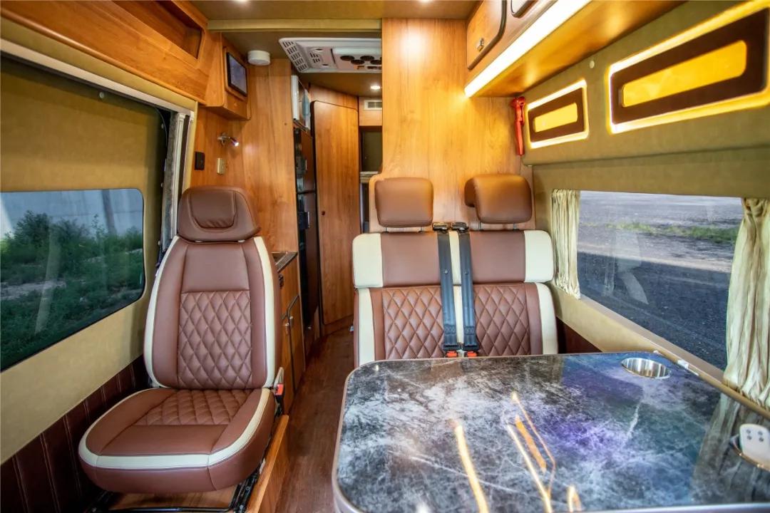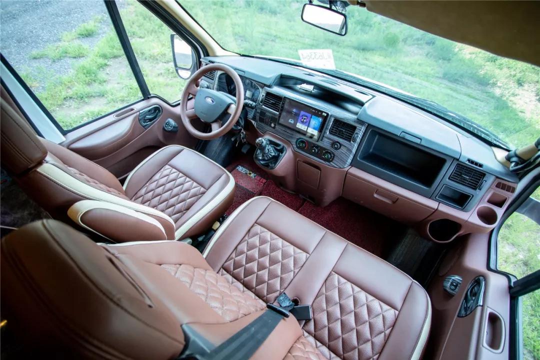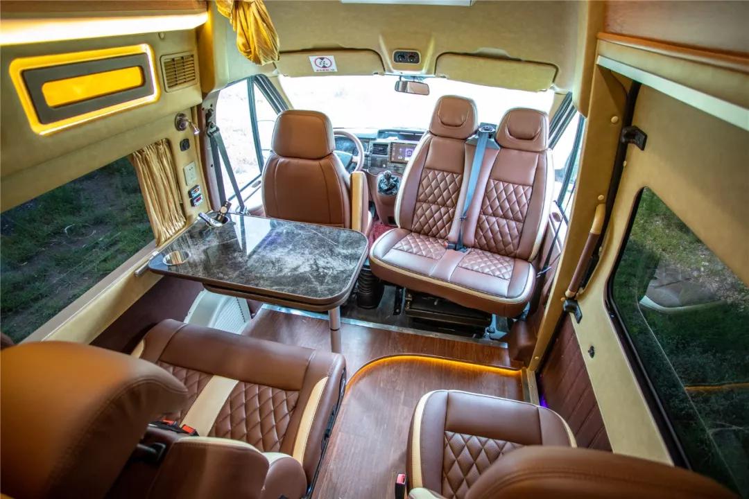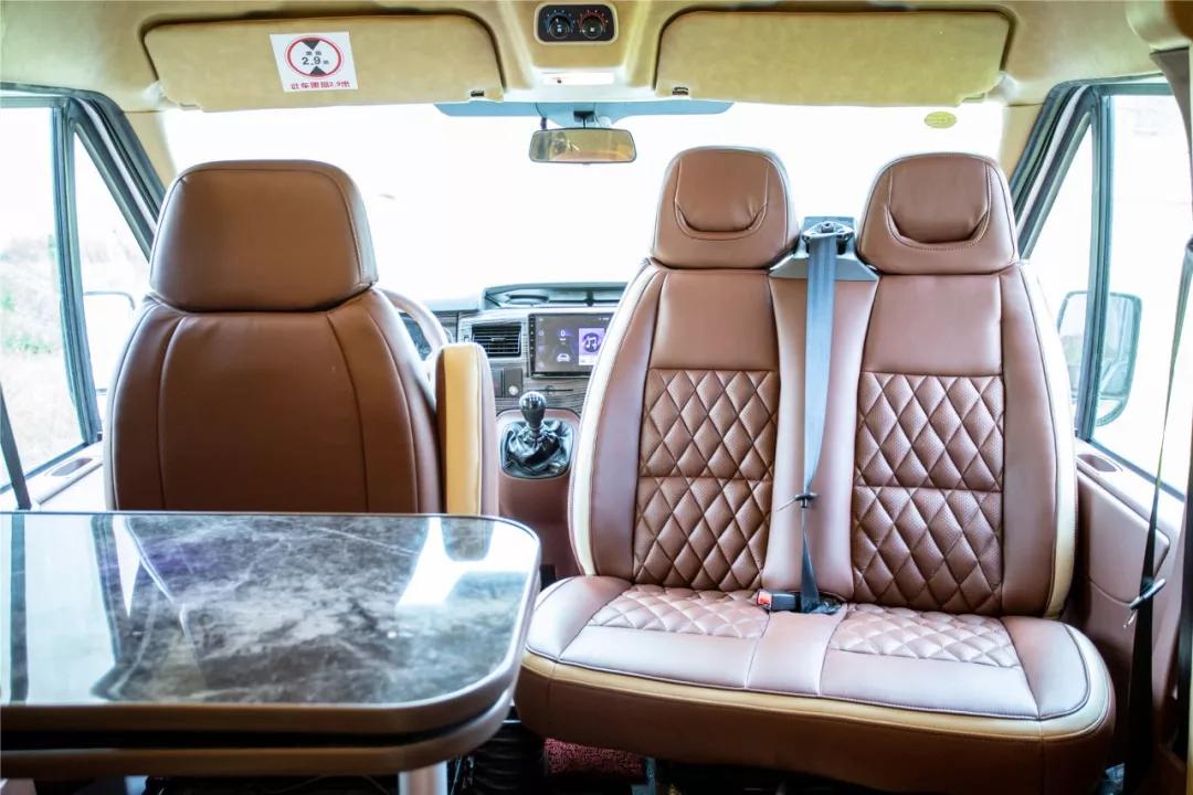 车厢后部生活区域,受限于B型房车车身尺寸,生活区的空间并不是很大,只能说够用,车内采用了大量皮质软包处理,提升了车内档次,营造出了不错的豪华感。