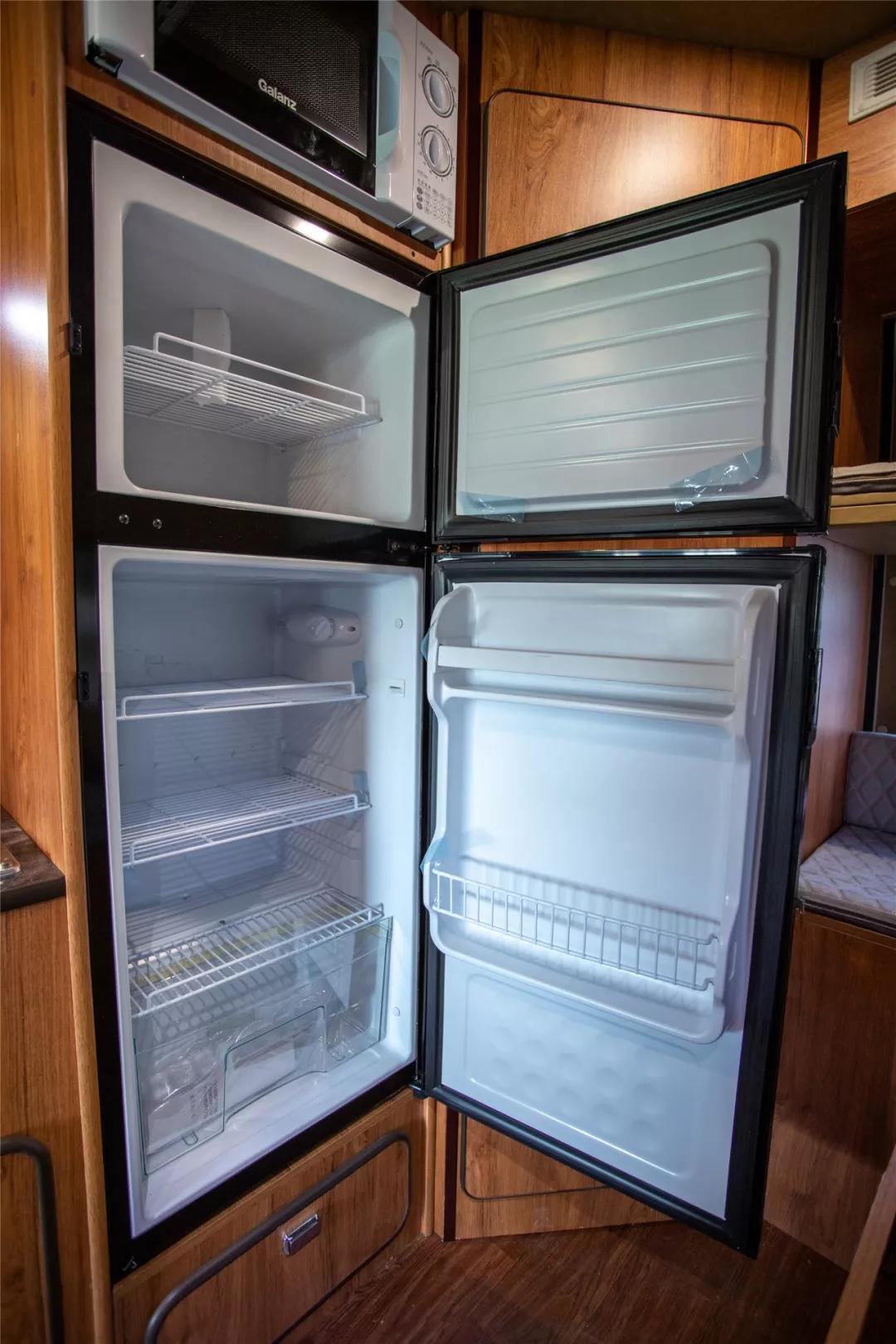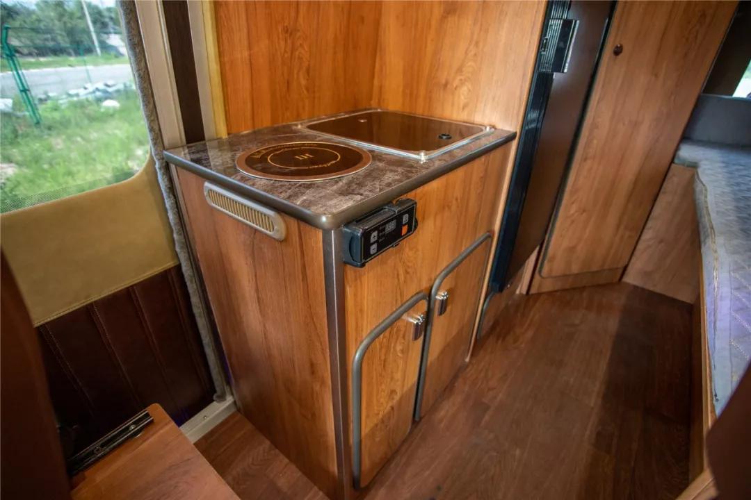 车厢后方是厨卫和主休息区。厨房区域提供了电磁炉、洗菜池、冰箱、微波炉等常用设备,解决日常吃饭还是没有问题的。
