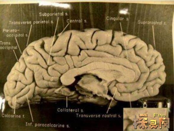 爱因斯坦大脑的阁下视图,哈维生前拍下了这些照片。2013年闻名人类学家迪恩,在经过长时间的对比后有了重大发明——普通人的前额叶只要三条褶皱,而爱因斯坦的前,额叶竟然有四条褶皱!