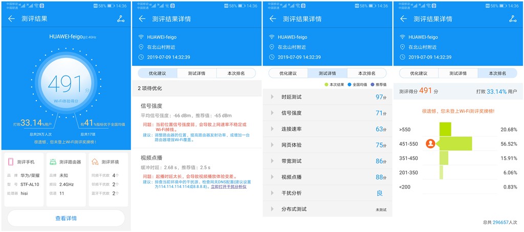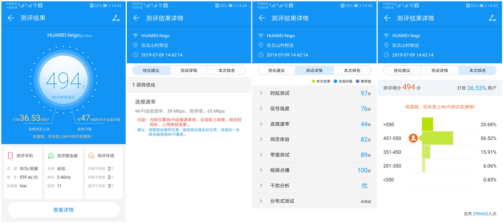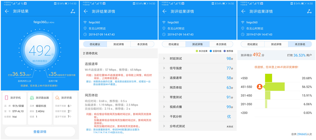 通过测试总分的表现上看,华为路由器仍然处于上风,也通过此款APP再次认证了路由器传输速度上的区别,在较为复杂的干扰环境中,对于华为路由器WS5200四核版采用自主研发的凌霄四核1GHz CPU,通过信道自动优化技术,没有被其他WIFI信号干扰,仍能够保持原有的信号稳定性,表现也较好。