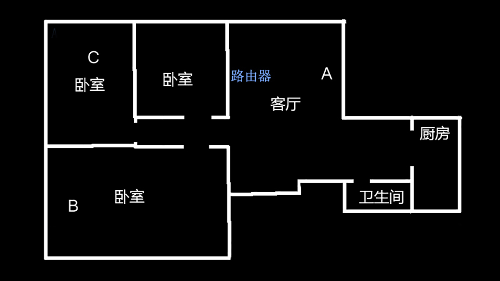 C点为次卧,需要穿越两道墙,虽然比B点距离稍近一些,但穿墙后信号衰减会很明显,为此检验两款路由器的测试点。